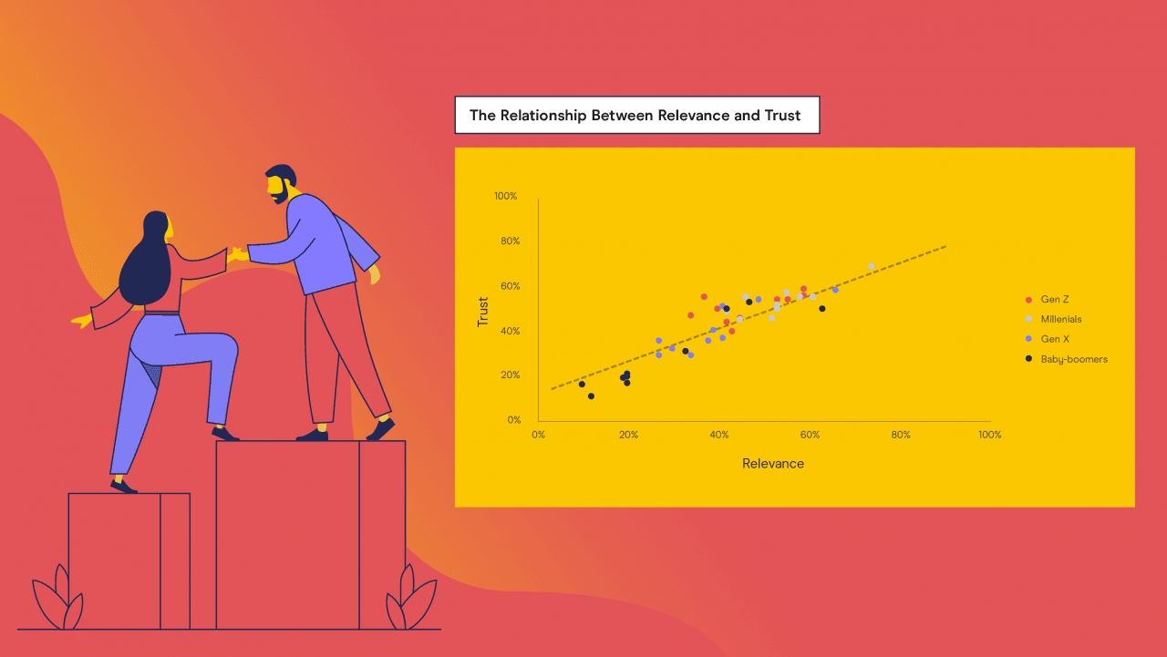 By plotting the relative relevance and trust for each channel by generation, we can see that there is a clear relationship between the two. Meaning that as the relevance of a channel increases, seemingly so does the trust a customer has in it – and vice versa.
