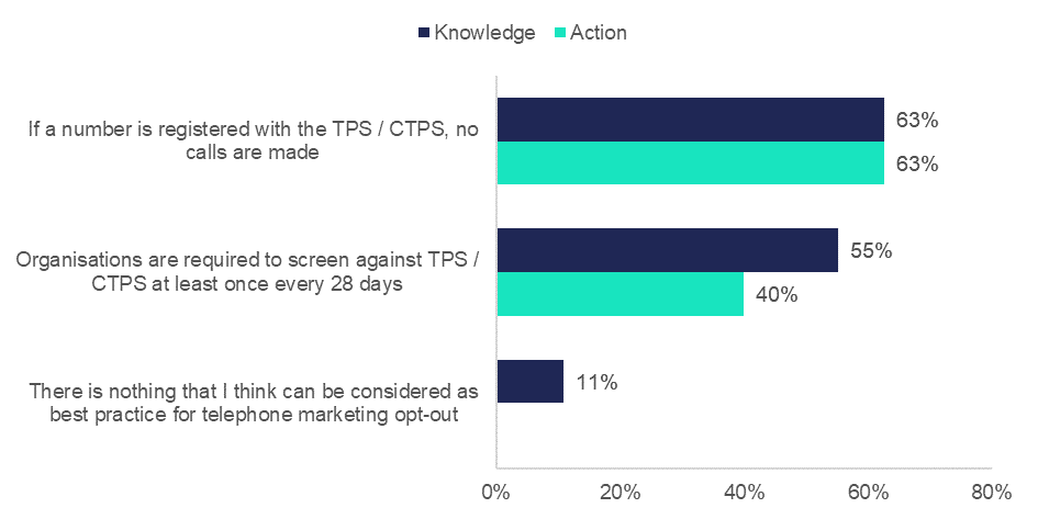 Encouragingly, almost two-thirds of marketers (63%) recognise that it’s good practice that, if a number is registered either with TPS or CTPS, no calls should be made. Similarly, 55% understand organisations are required to screen against TPS/CTPS at least once every 28 days.