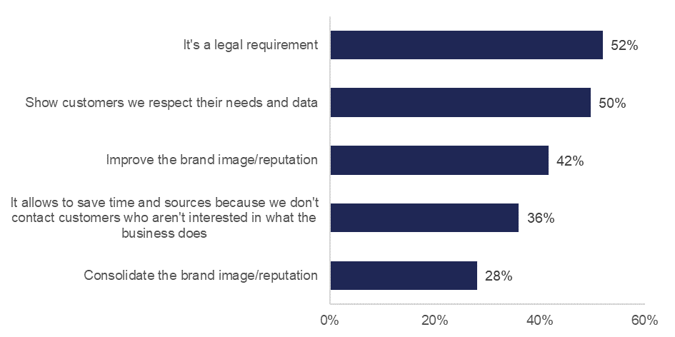 Half of marketers use the TPS services because they consider it as a legal requirement (52%) and to show customers they respect their needs and data (50%). This, again, is slightly concerning given customers’ data should be treated with the highest care in order to build long-lasting relationships founded on trust.